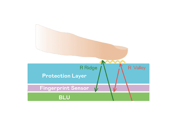 TFT 指纹扫描感测技术利用薄膜电晶体 (TFT) 当作光感测元件,,,藉由非晶硅 (a-Si) 与低温多晶硅(LTPS)既有光电转换特性对不同波段光源进行吸收,,,使感测 IC 读取阵列感测元件的光漏电差异,,,转换成数位灰阶影像。。。。